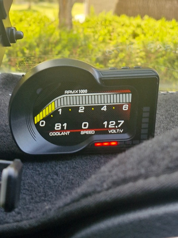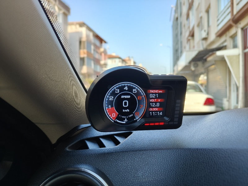 6. OBD modu ekran bilgisi: araç hızı, zaman, dönüş hızı, su sıcaklığı, voltaj, sürüş süresi, sürüş mesafesi, uydu sayısı, sürüş yönü, enlem ve boylam gösterimi, yağ sıcaklığı, turbo basıncı, hızlanma testi, fren testi, irtifa Alarm fonksiyonu: aşırı hız alarmı, yüksek su sıcaklığı alarmı, düşük/yüksek voltaj alarmı, yorgunluk sürüş hatırlatıcısı, motor arızası alarmı