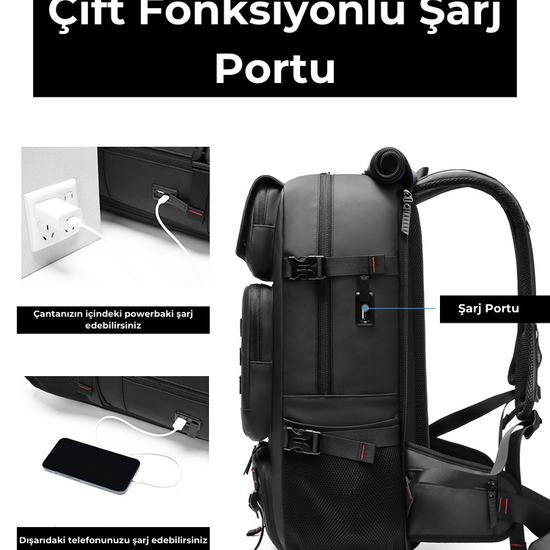 Su Geçirmez 17.3" inç 60L Ayakkabı Bölmeli Seyahat Sırt Çantası - Laptop Bölmeli, USB Şarj Girişli